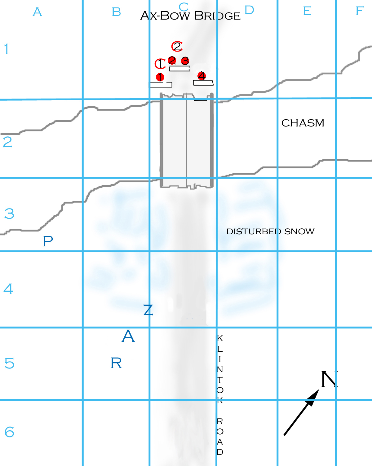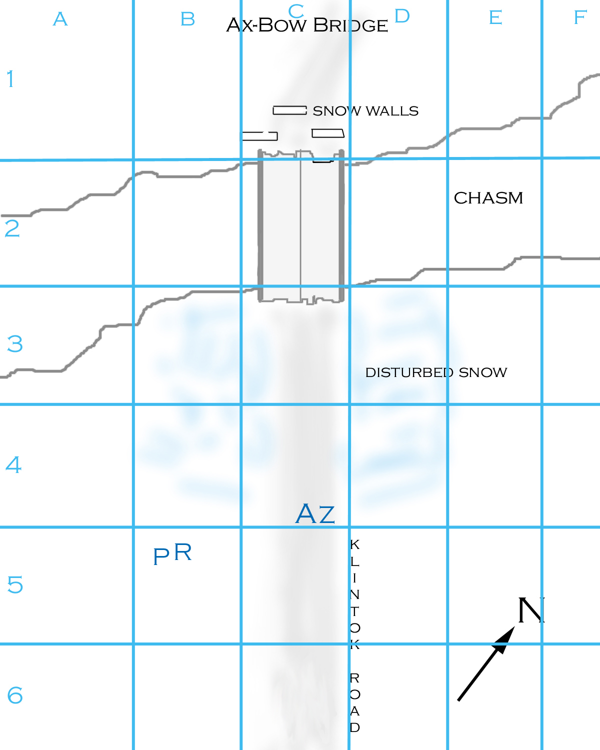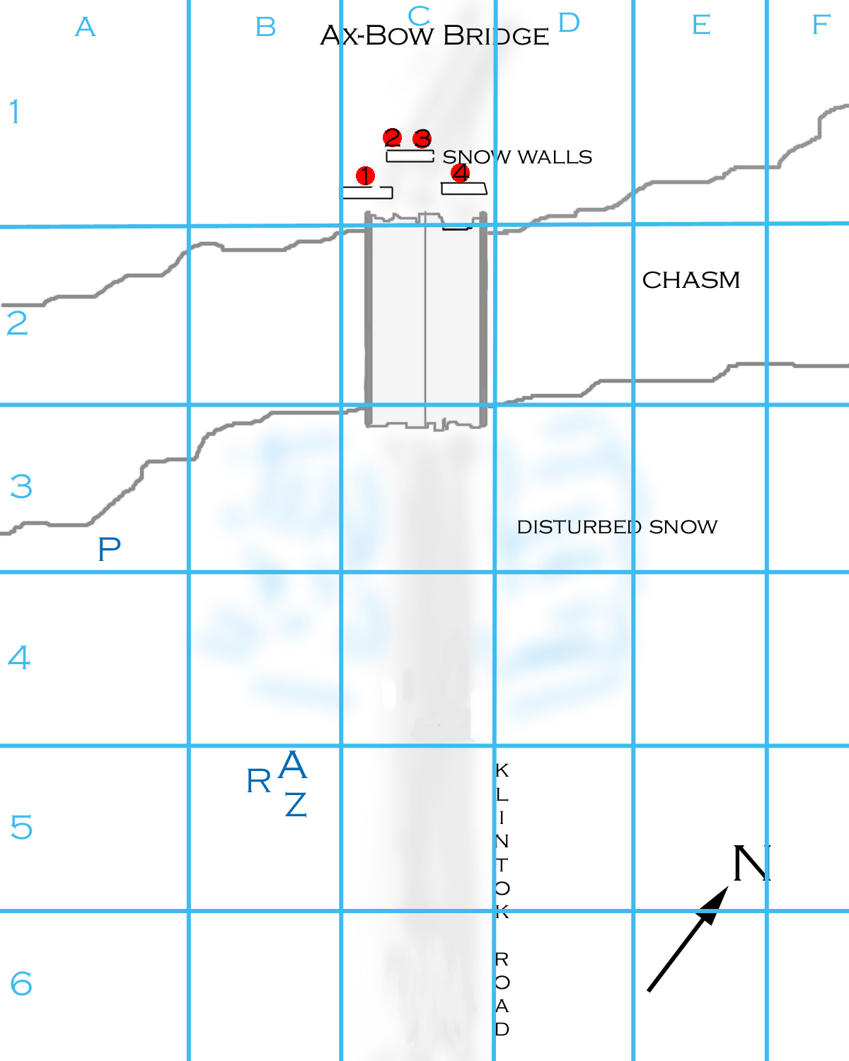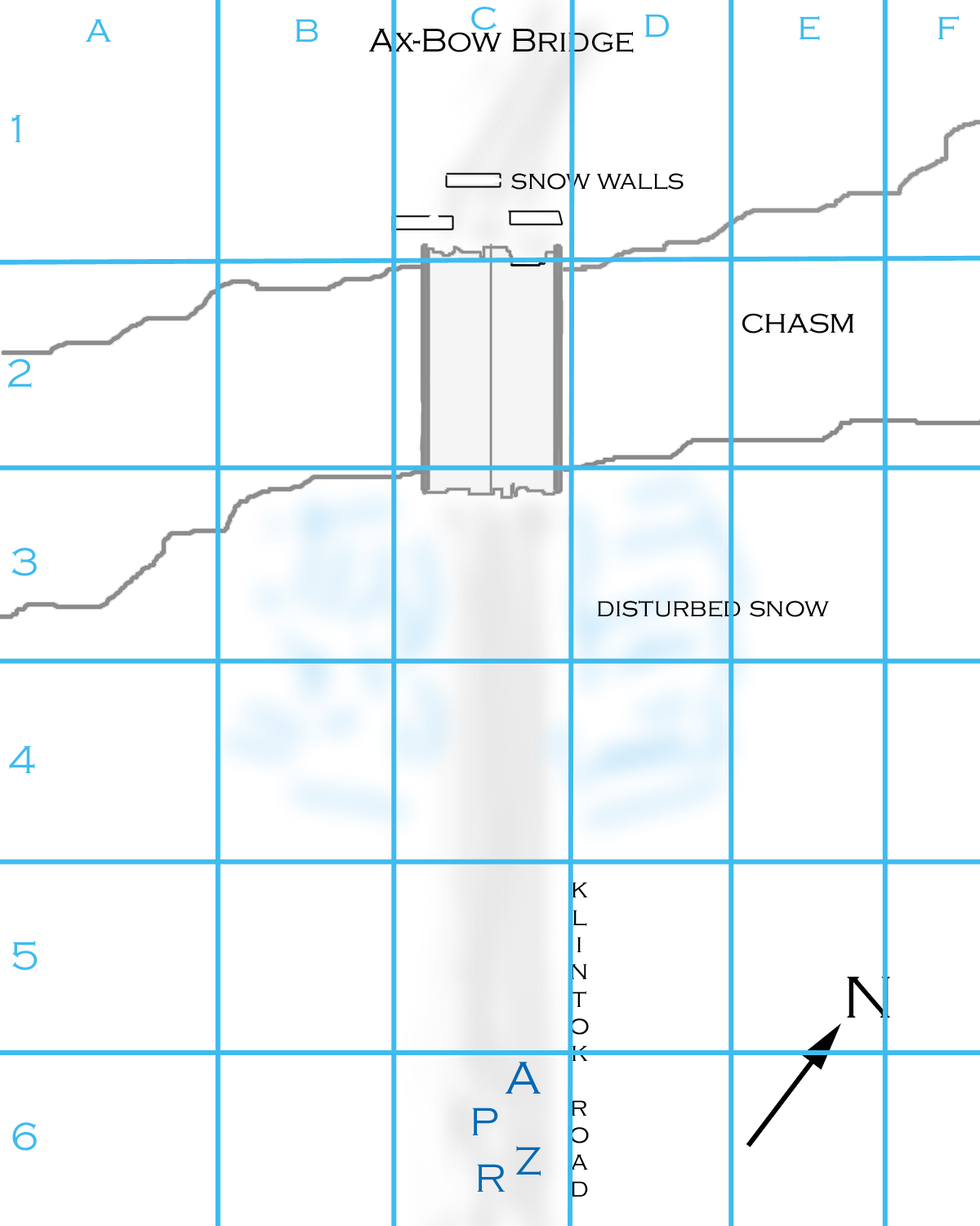 Arvak throws the grenade when the chowzers are about 1/2 way down the bridge. The throw (15): 7 2 = green. It hits just in front of the center walls and detonates. (BOOM!) Chunks of metal fly, and a bunch of snow falls off the walls to show that they are actually made of piled rock. The grenade gets an attack roll against each target in range, which includes the hoops and choo-wugs (the chowzers are effectively out of range by the time it detonates).