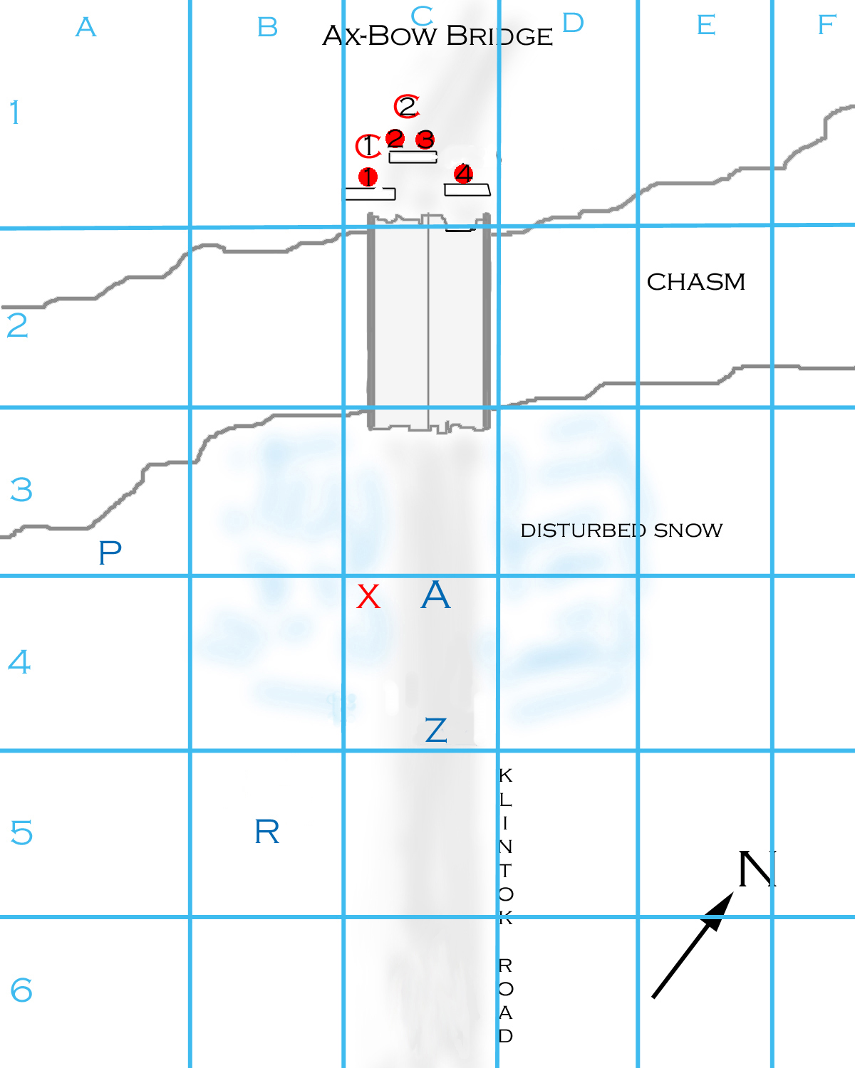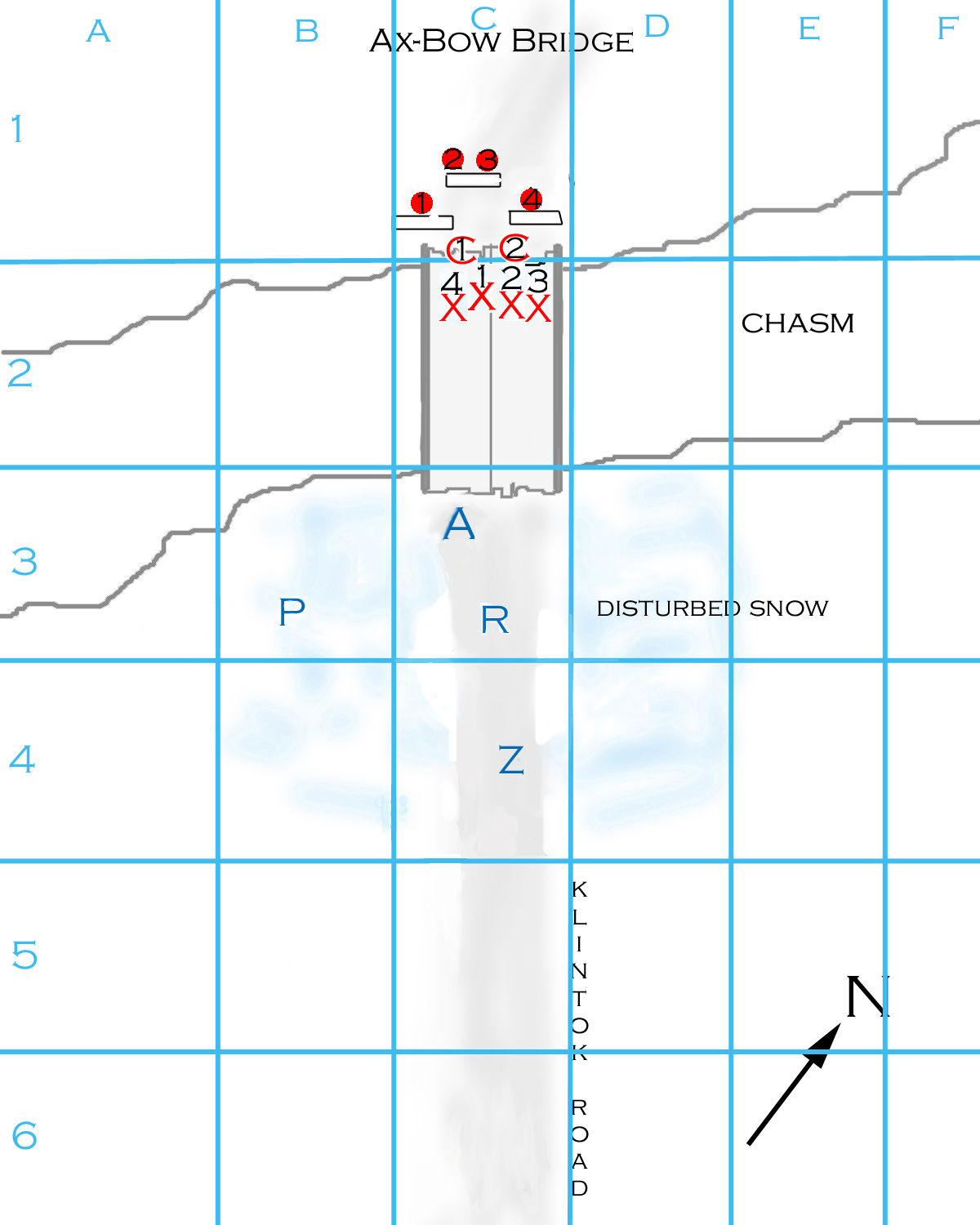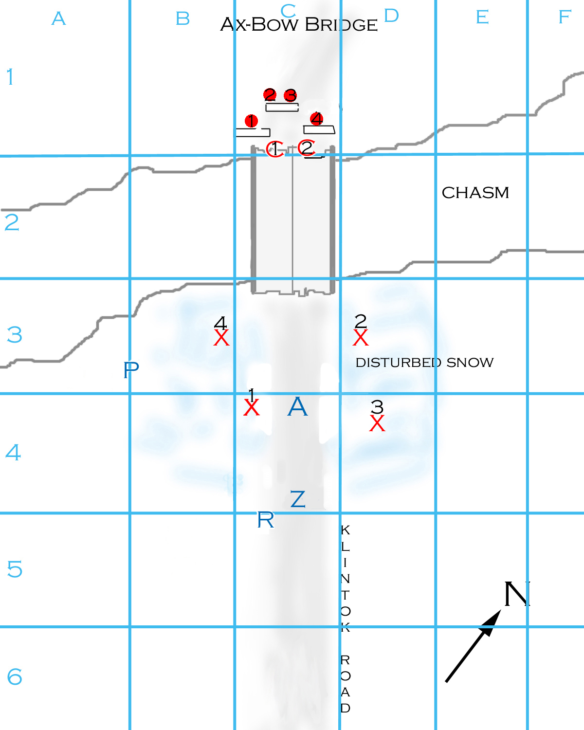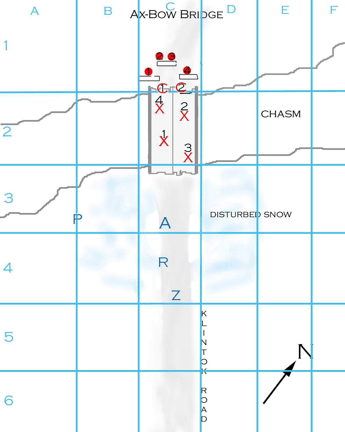 Arvak throws the grenade when the chowzers are about 1/2 way down the bridge. The throw (15): 7 2 = green. It hits just in front of the center walls and detonates. (BOOM!) Chunks of metal fly, and a bunch of snow falls off the walls to show that they are actually made of piled rock. The grenade gets an attack roll against each target in range, which includes the hoops and choo-wugs (the chowzers are effectively out of range by the time it detonates).