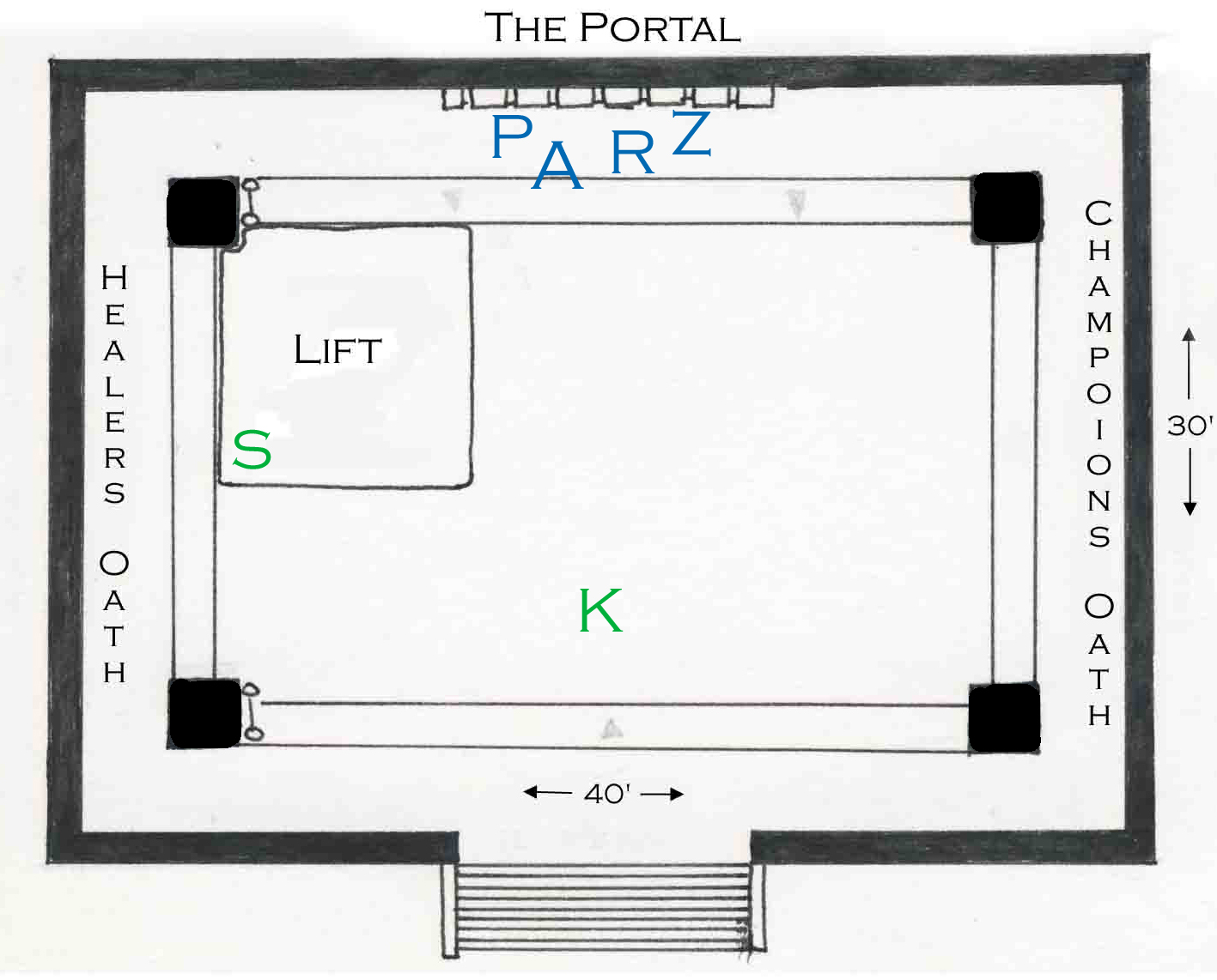 Your group heads back into the Champion’s Tower and seeks SANCTUARY!! After looking at your wounds, the healers assistant brings you all up to the next level on the lift. Then she goes to get Healer John Trapper.